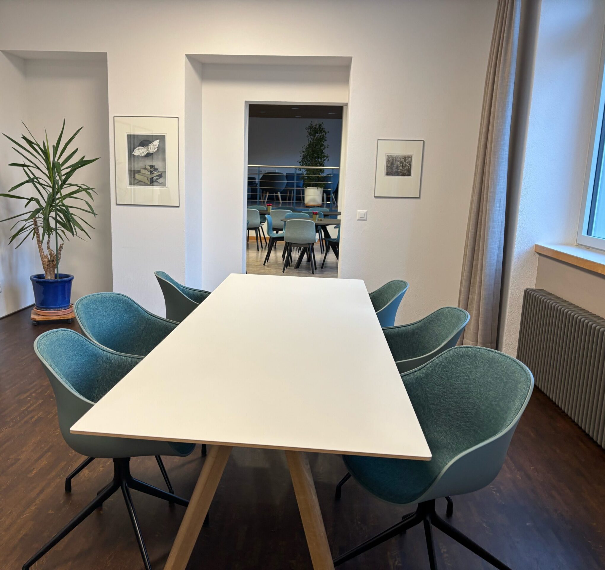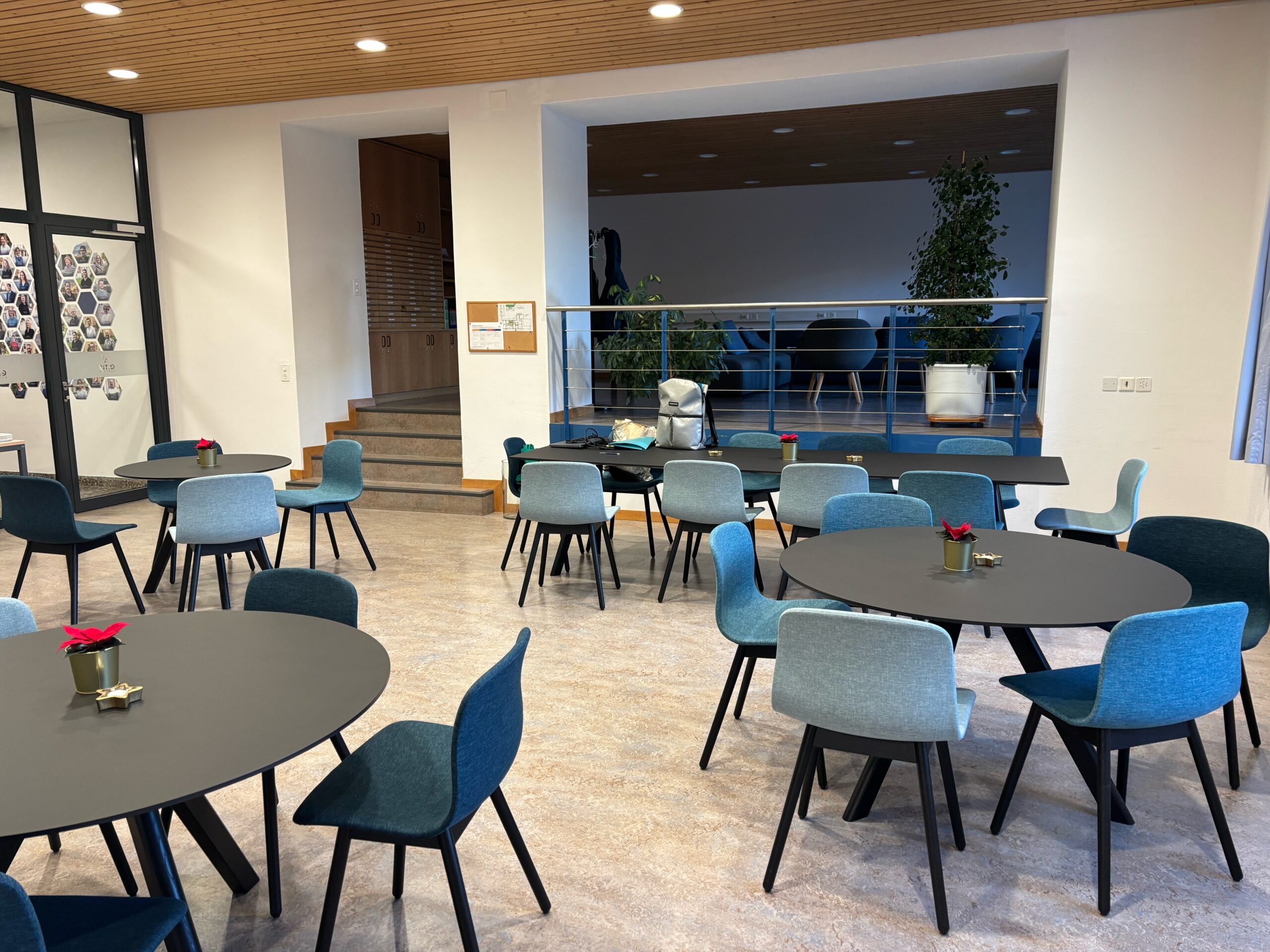 Auch der zentrale Bereich hat ein frisches Gesicht erhalten: Eine neue Küchenzeile bildet nun das Herzstück des Raumes. Farblich abgestimmt auf die bequemen, neuen Stühle fügt sie sich harmonisch ins Gesamtbild ein. Besonders ins Auge fällt die abwechslungsreiche Möblierung: Runde Tische in verschiedenen Grössen, ein langer rechteckiger Tisch sowie ein Hochtisch mit Barstühlen bieten vielfältige Möglichkeiten für Austausch, Zusammenarbeit oder eine kurze Pause zwischendurch.