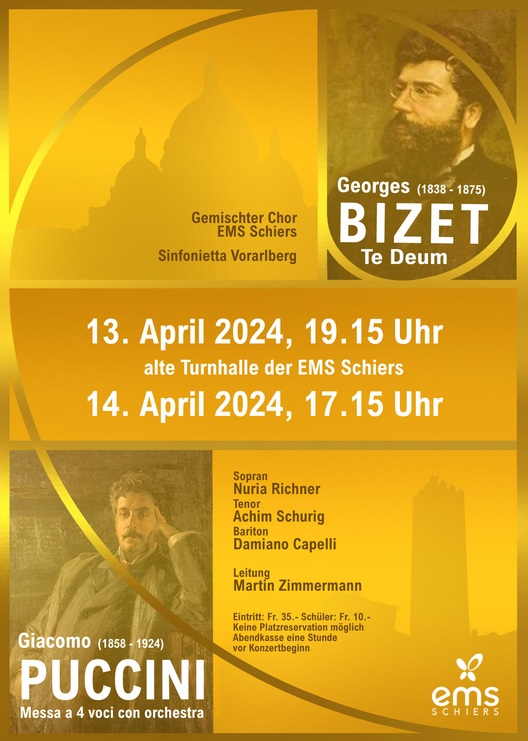 Am 13. und 14. April 2024 präsentiert der gemischte Chor der EMS Schiers zusammen mit der renommierten Sinfonietta Vorarlberg zwei herausragende Stücke der Musikgeschichte. Unter der Leitung von Martin Zimmermann und mit Unterstützung dreier talentierter Solisten bringen sie Georg Bizets «Te Deum» und Giacomo Puccinis «Messa die Gloria» auf die Bühne.