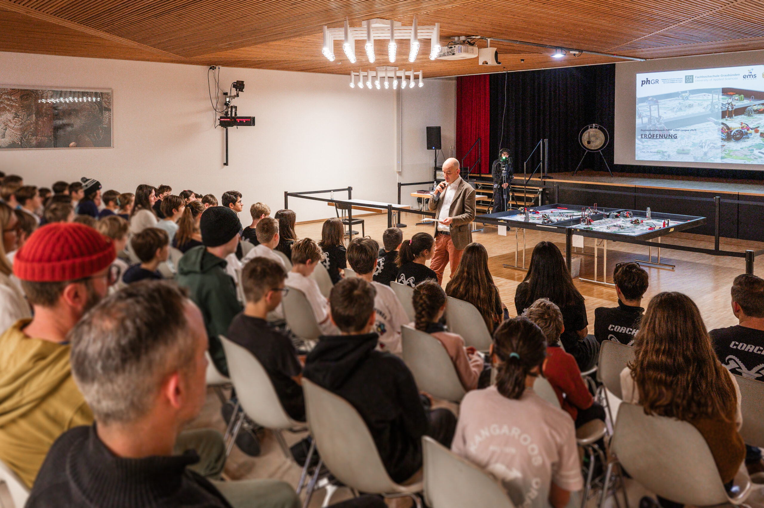 Frühmorgens trafen die Teams aus Chur, Landquart, Schiers, Davos und Domat/EMS der Kategorie Challenge an der Pädagogischen Hochschule in Chur ein. Nach der Begrüssung des Rektors der PH Graubünden Prof. Dr. Reto Givel-Bernhard starteten die 9- bis 16-Jährigen mit der Vorrunde der Robot-Games.