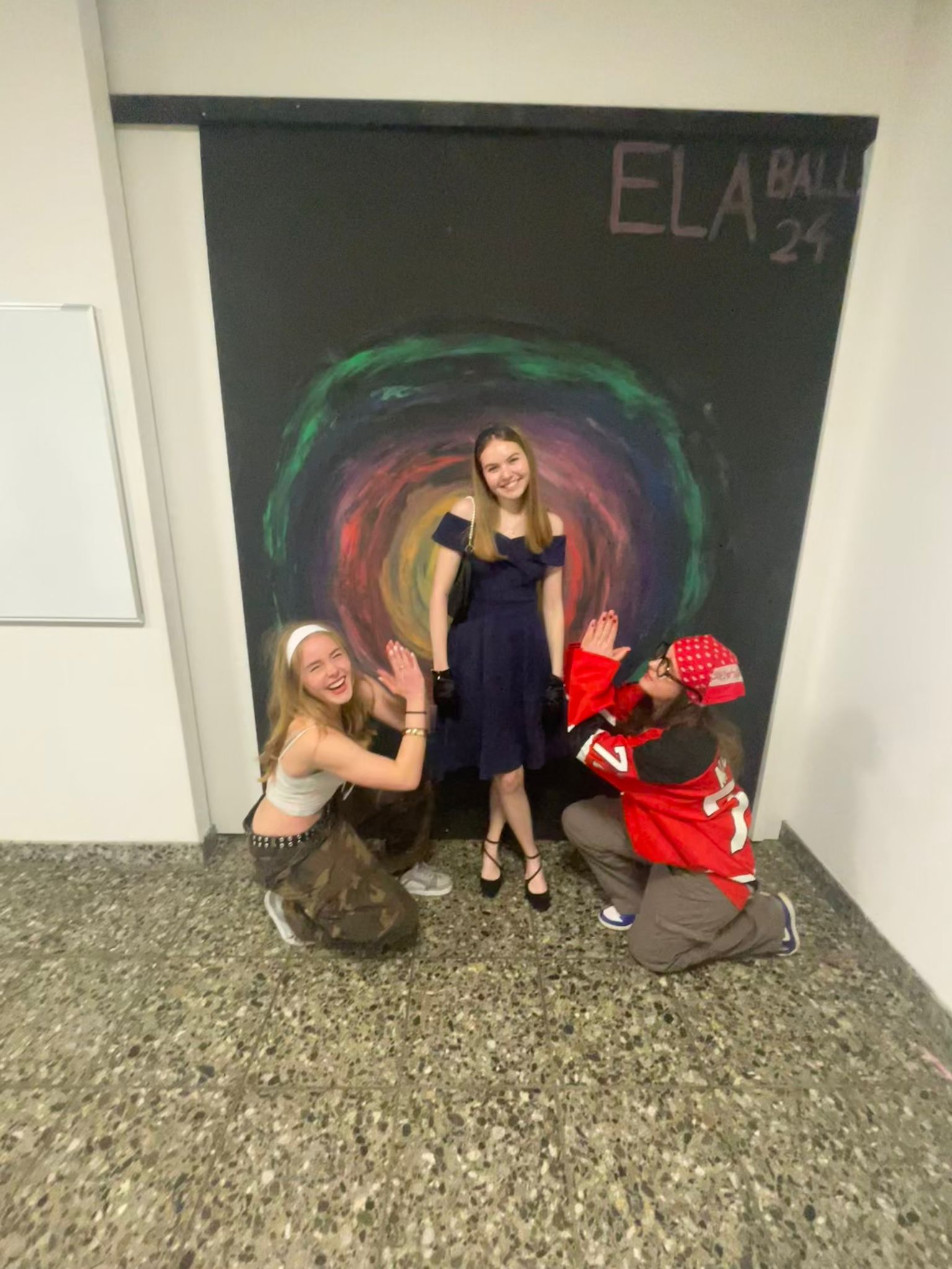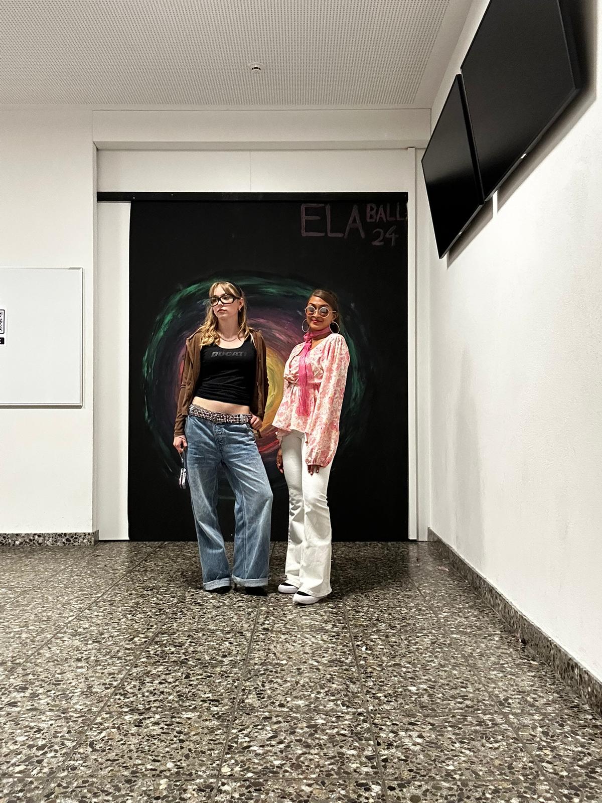 An den ELA-Ball selbst gelangte man durch den liebevoll dekorierten Zeitreisetunnel. Dieser war mit Lichterketten geschmückt und zeigte viele alte Bilder, unter anderem auch von der EMS Schiers. Mit dem Thema «The Story of Eras» öffnete das Organisationsteam ein Zeitfenster der letzten hundert Jahren. Die Turnhalle war festlich geschmückt mit Girlanden, Discokugeln und farbigen Luftballons. Der engagierte DJ startete mit Musik aus den 1920er Jahren und spielte im Verlauf des Abends immer moderne Songs. Einige Male forderte er die Gäste zum Flashmob auf. Da alle Schüler:innen den Tanz zu «Footloose» gelernt hatten, füllte sich die Tanzfläche schnell. Der ganze Song wurde durchgetanzt, danach verteilte sich die Menge wieder. Gab es ja noch die tolle Fotowand, die wie jedes Jahr fleissig genutzt wurde.